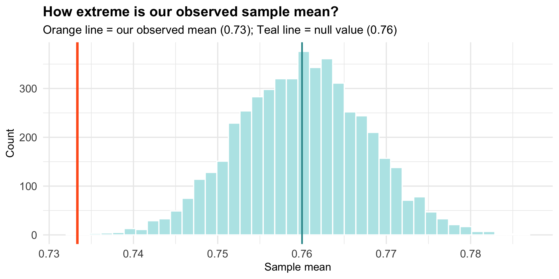 HOW LIKELY would it be to observe a sample mean as far from 0.76 as ours (\(\bar{x}\) = 0.73)?