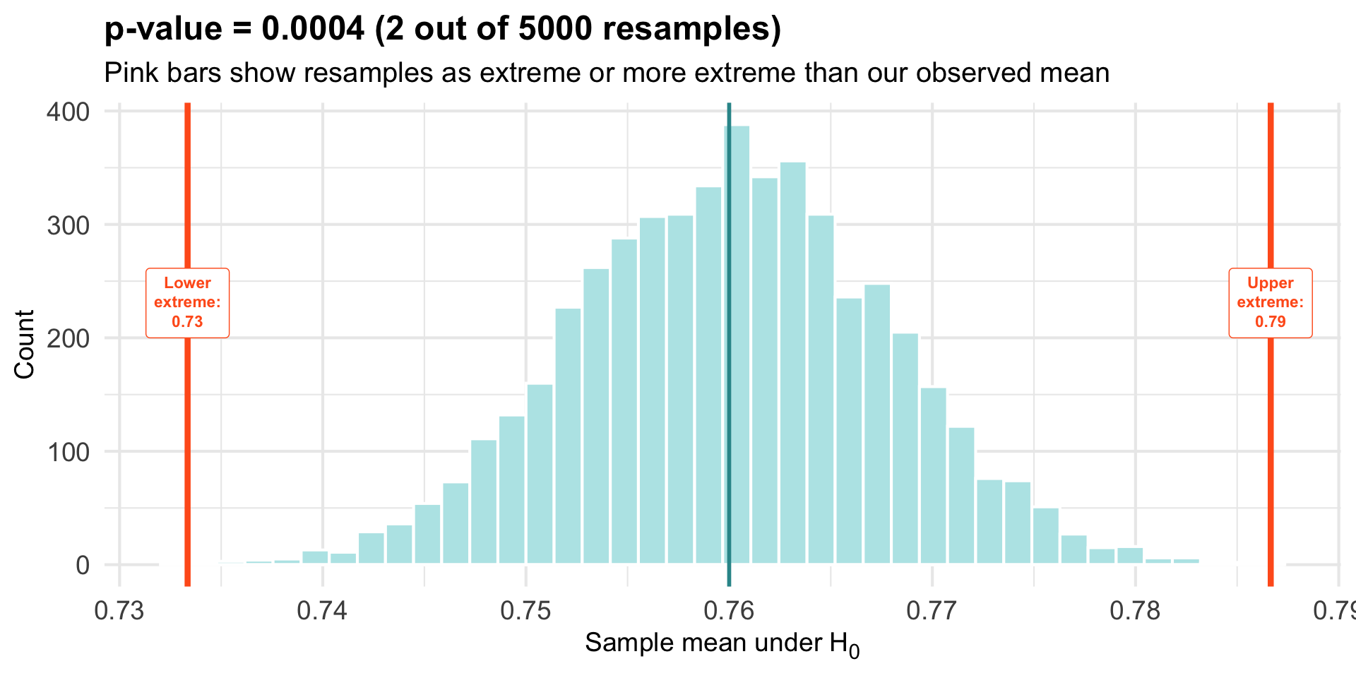 | Check if 0.76 falls outside the CI | Check if our sample falls in the extreme tail of null sampling distribution |