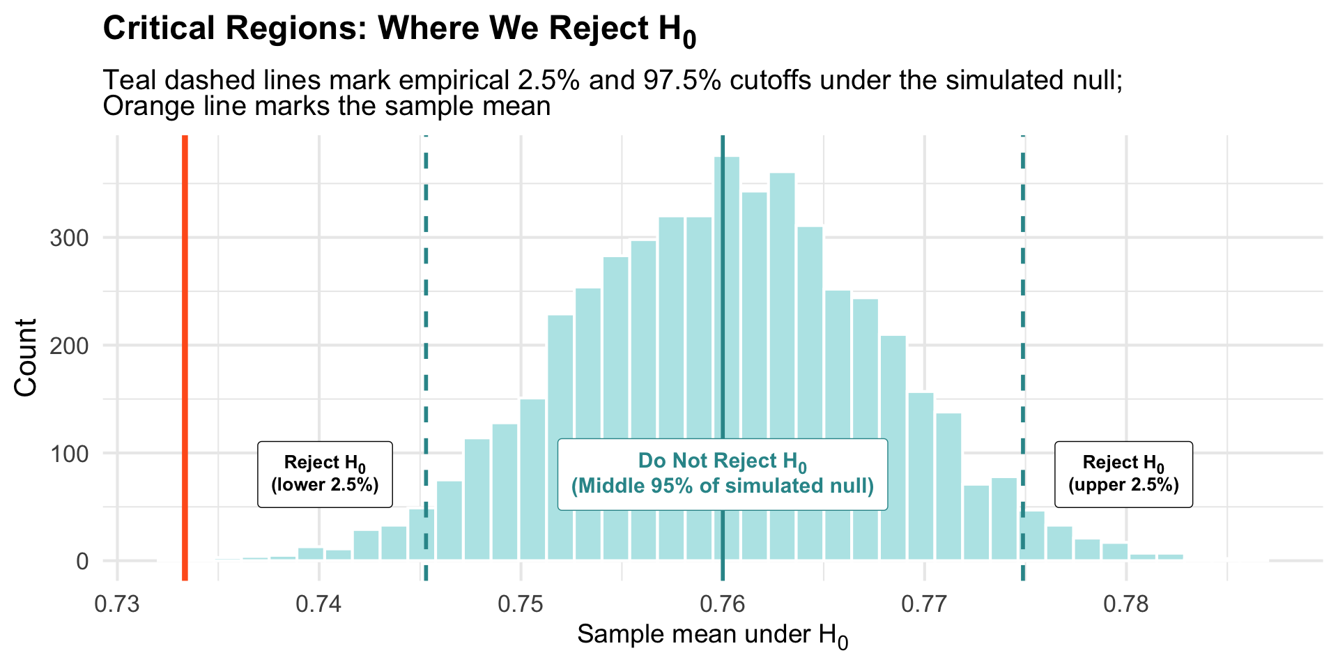 Our observed mean (orange) falls in the rejection region → statistically significant.