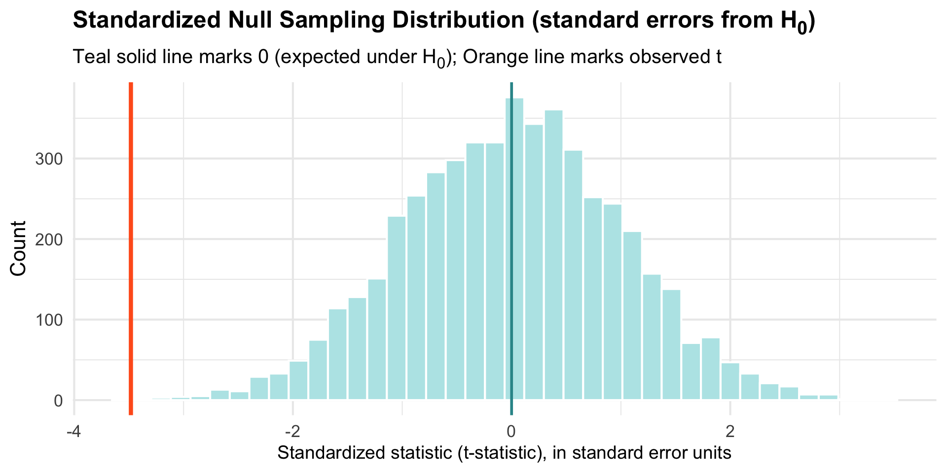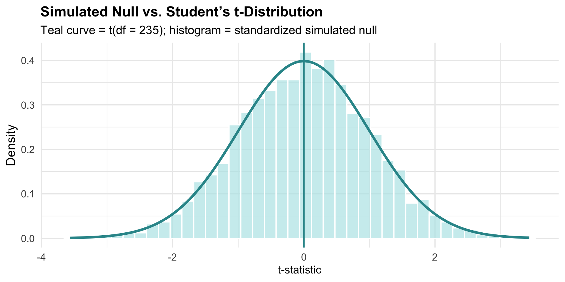 When these hold, the standardized null sampling distribution follows a known mathematical form: Student’s t-distribution with \(df = n - 1\) degrees of freedom (for estimating a population mean).