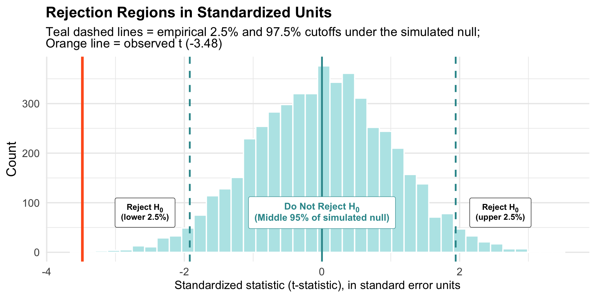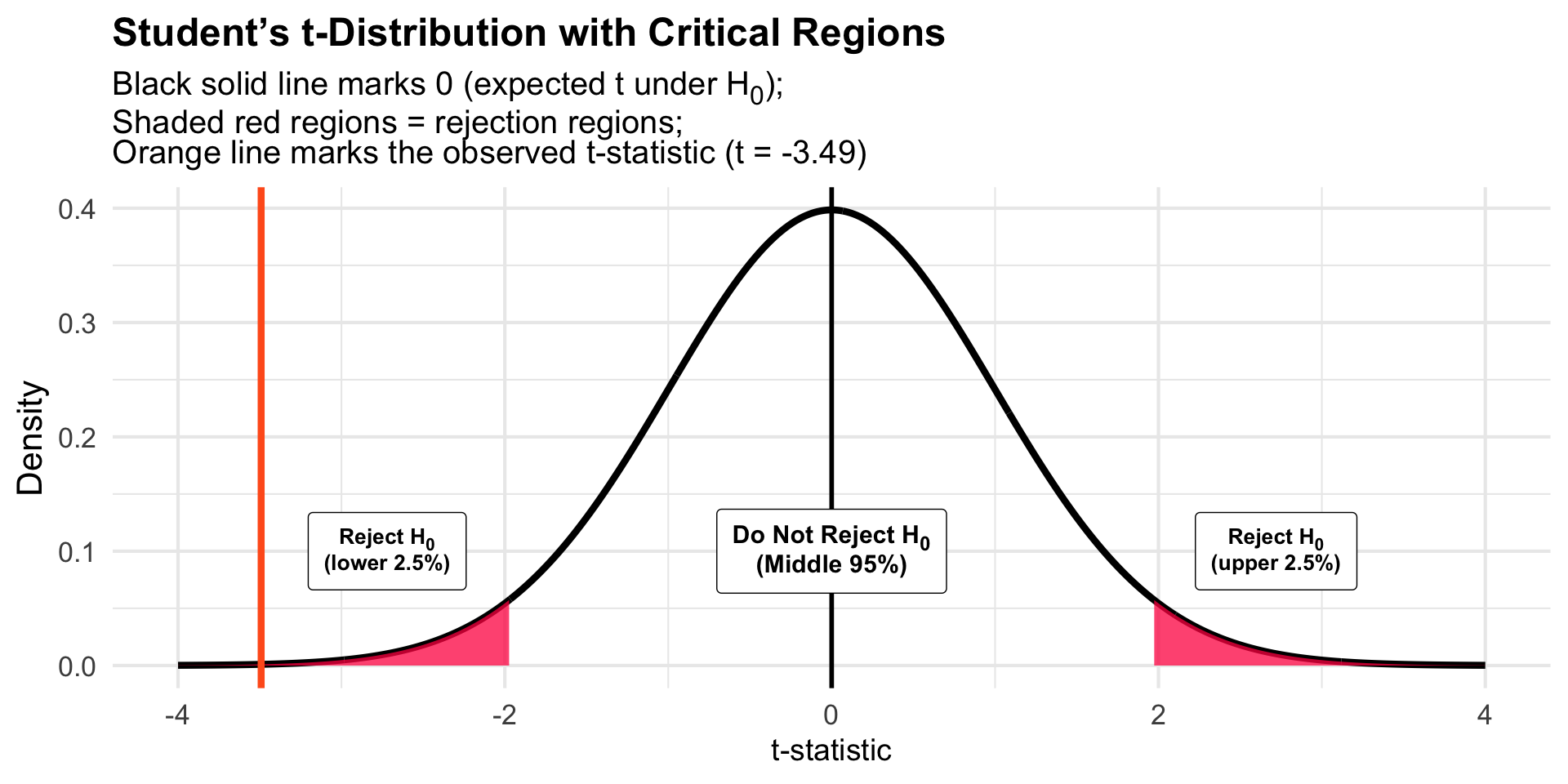 qt() and/or calculate p-value using pt()Key insight: A 95% CI that excludes the null value, a p-value < 0.05, and a t-statistic in the rejection region all tell the same story!