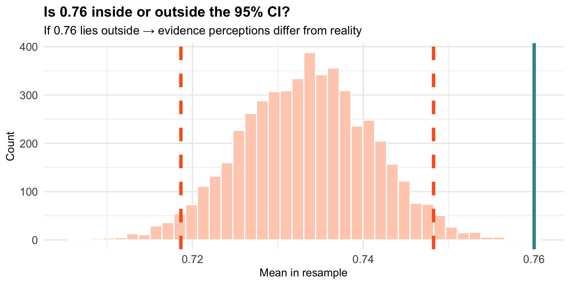 \(H_A\): \(\mu \neq 0.76\): Participants’ perceptions systematically differ from reality.