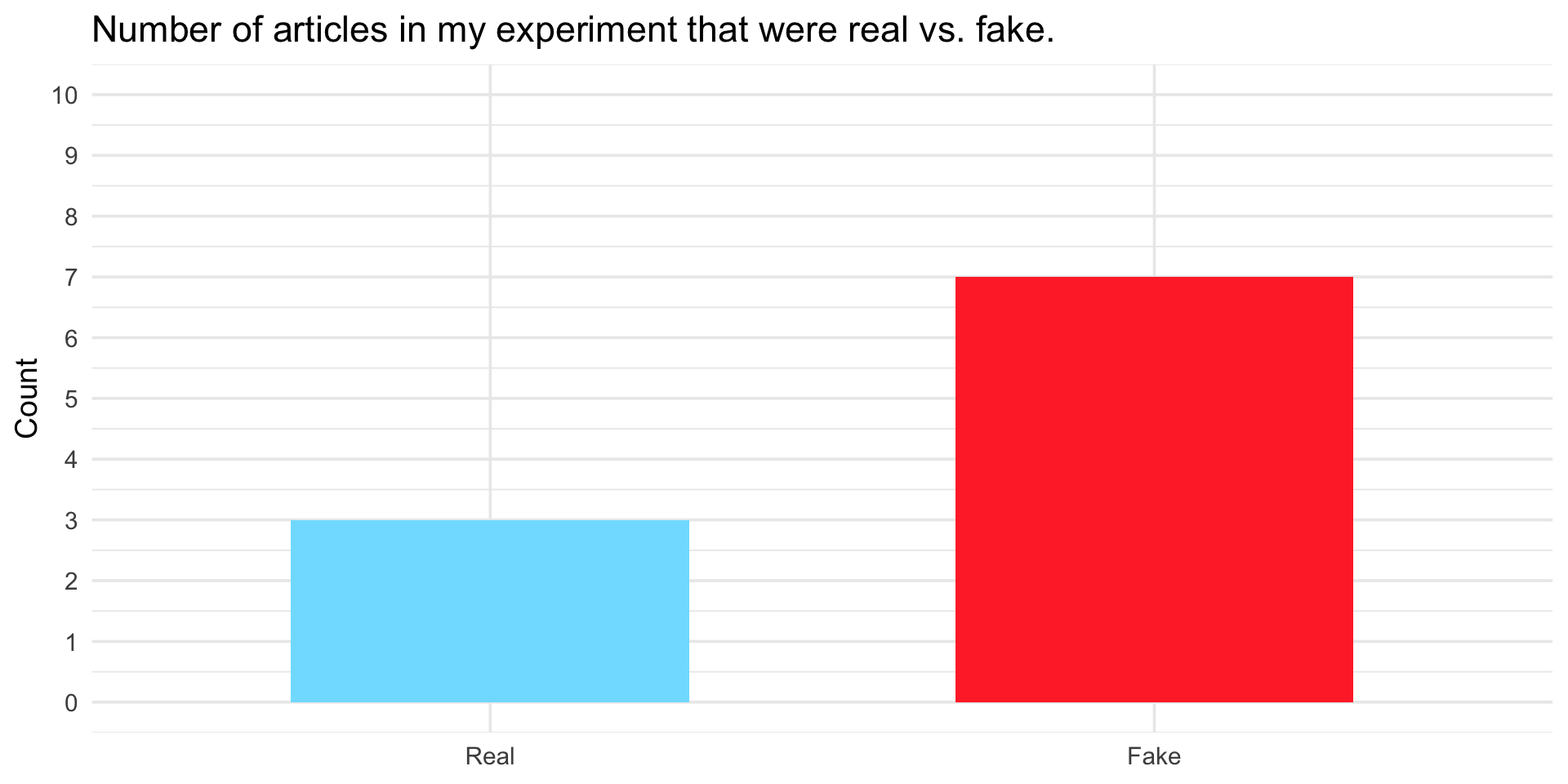 On your worksheet, create a bar chart to represent the number of articles you selected that were real and fake.