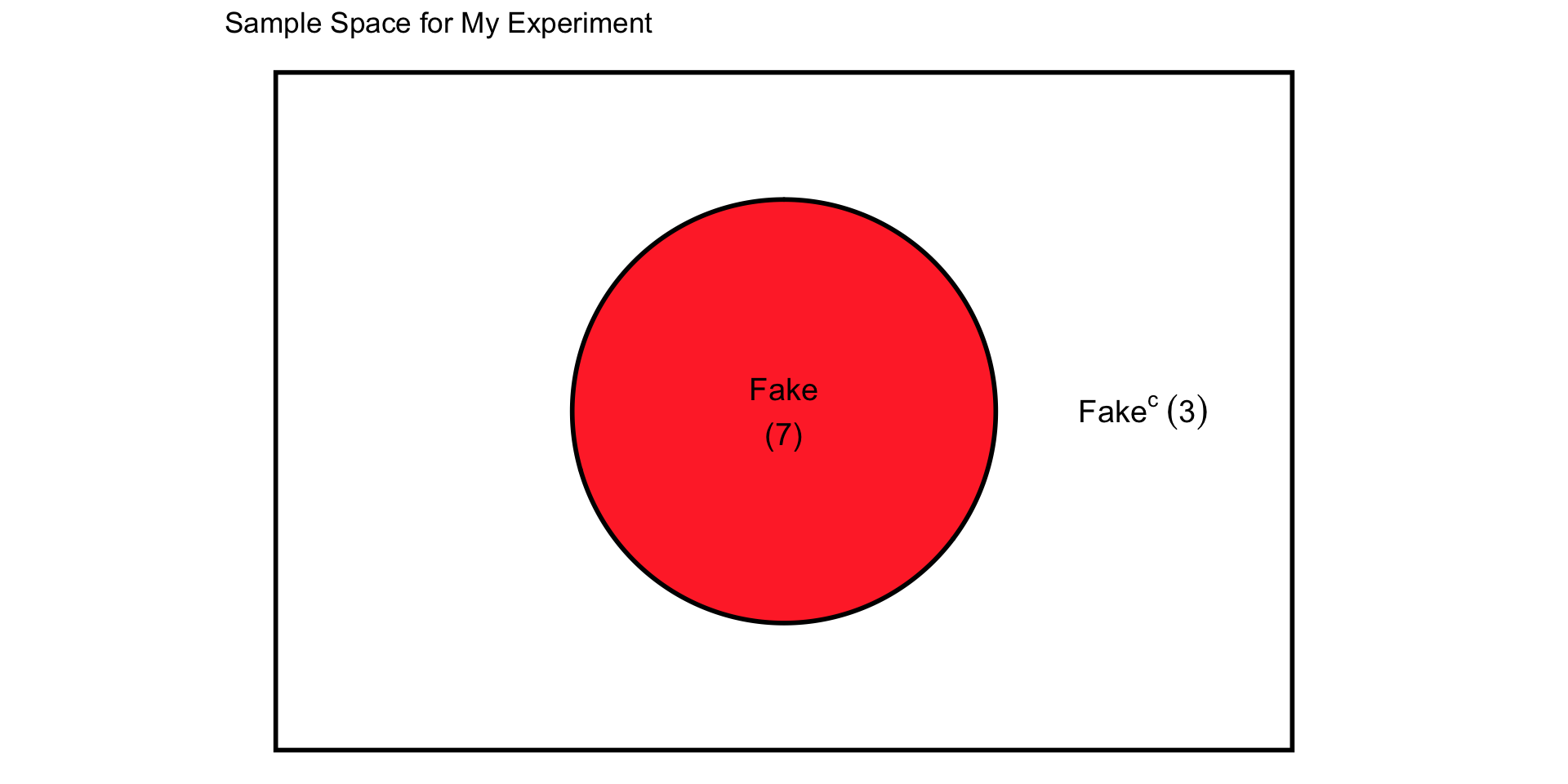 Represent the same information in the sample space diagram on your worksheet. A sample space is the set of all possible outcomes of a random experiment (here: Real or Fake). Write the number of your drawn articles that are Fake inside the bubble. Write the number of your drawn articles that are not Fake (the complement of Fake — in other words, Real) outside the bubble but still inside the rectangle.