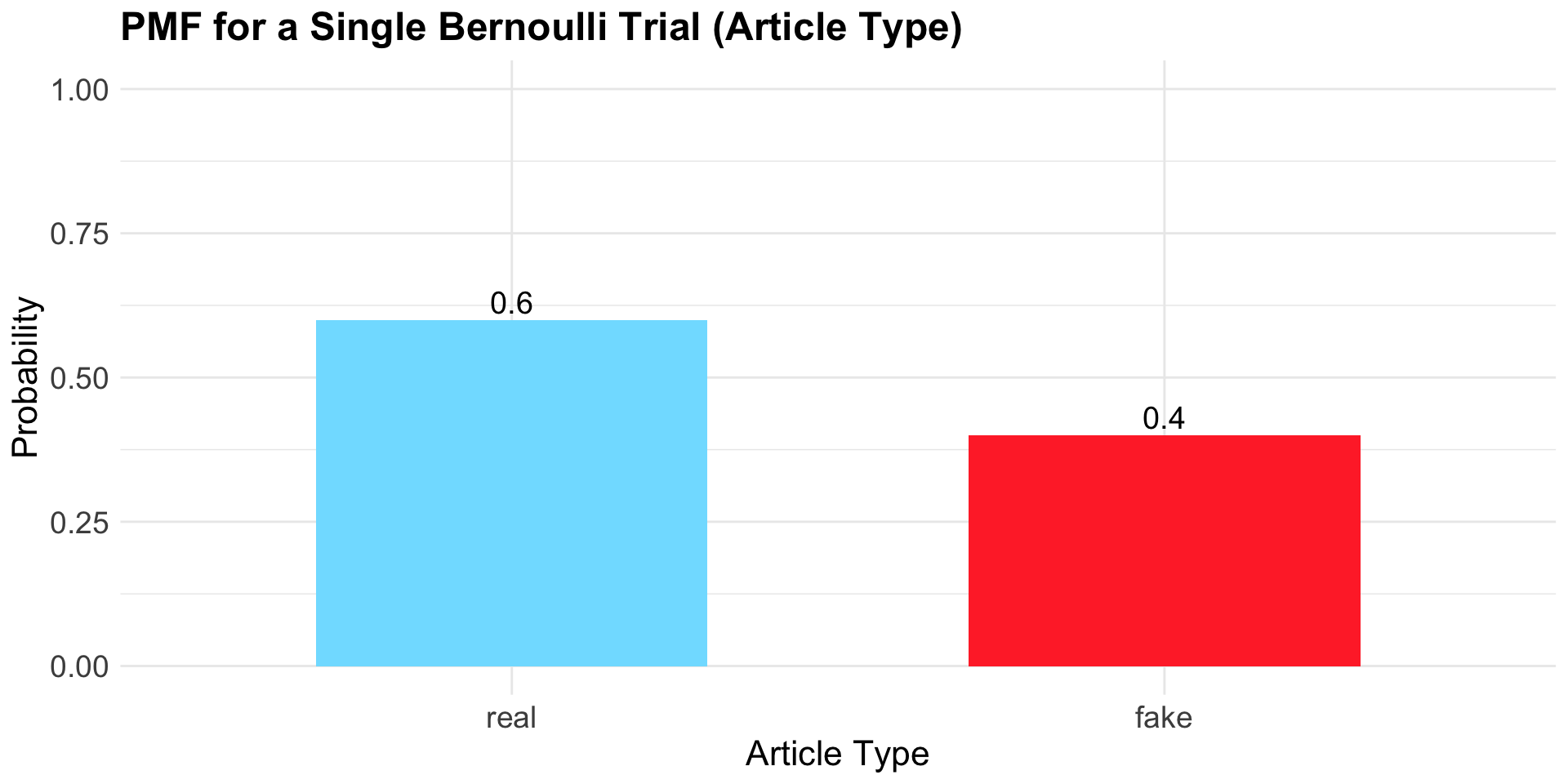 The Bernoulli PMF gives the probability of each possible outcome (Fake or Real) in a single trial.