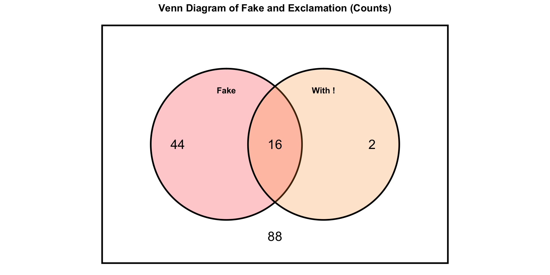 16 articles were fake and had an exclamation point, 44 were fake but didn’t have an exclamation point, 2 were real but had an exclamation point. The remainder (88) were real and didn’t have an exclamation point.