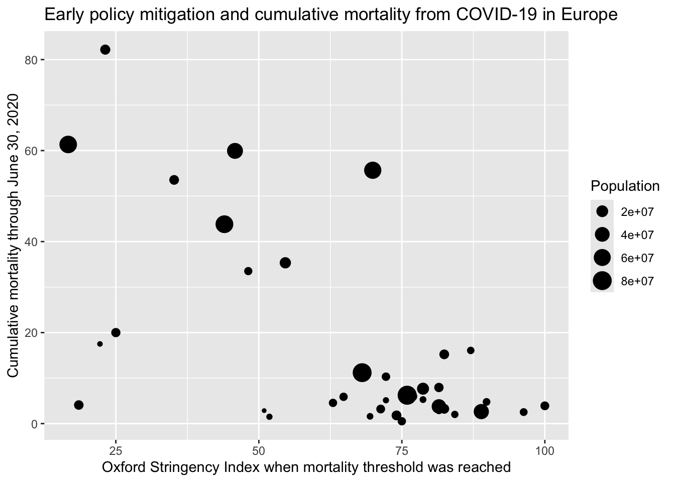 df |>ggplot(mapping =aes(x = stringency_index_death_threshold, y = mort_cumulative_june30)) +geom_point(mapping =aes(size = population_2020)) +labs(title ="Early policy mitigation and cumulative mortality from COVID-19 in Europe",x ="Oxford Stringency Index when mortality threshold was reached",y ="Cumulative mortality through June 30, 2020",size ="Population")