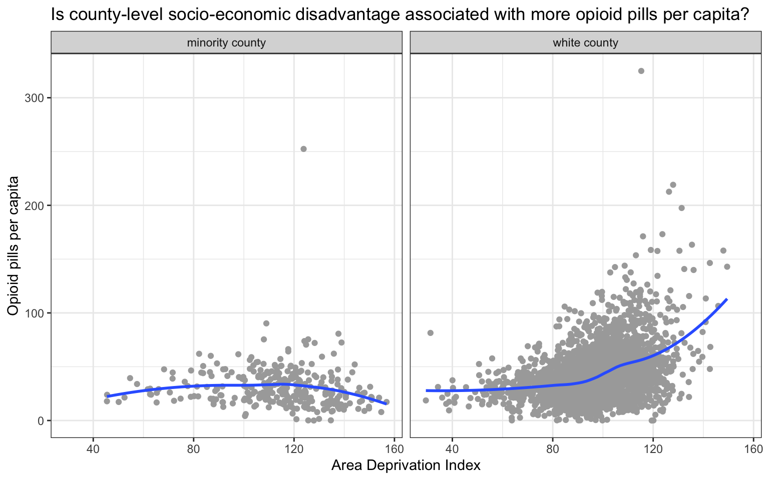 Among predominantly White counties, we see evidence that greater socio-economic disadvantage was associated with more pills per capita. Interestingly this trend is not apparent in predominantly minority communities. In other words, our graph suggests that in 2010, during the height of the time when opioid pills were flooding into American communities, the most pills were being directed to pharmacies in the most socio-economically disadvantaged (predominantly) White communities. If you’d like to read more about the marketing strategies used by Purdue Pharma to boost sales of OxyContin, please listen to this story by National Public Radio.