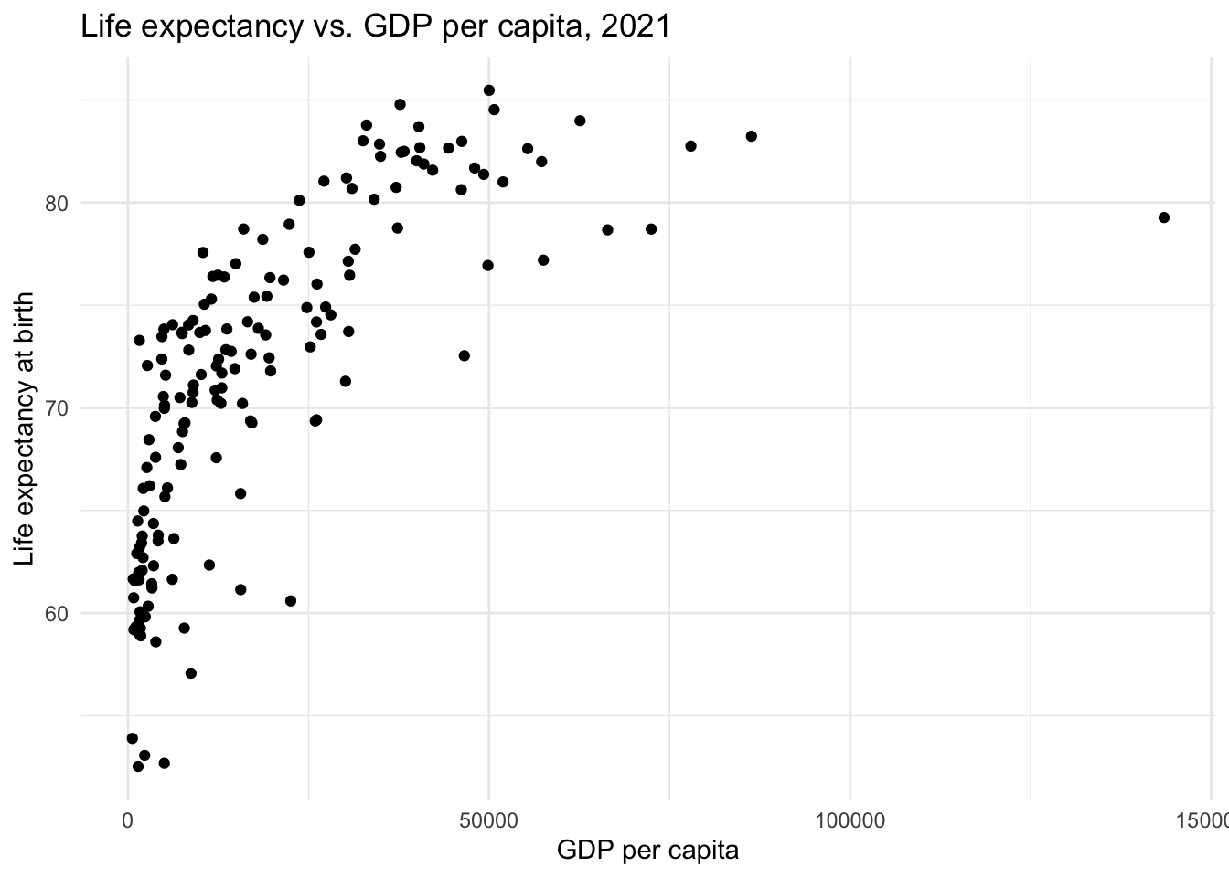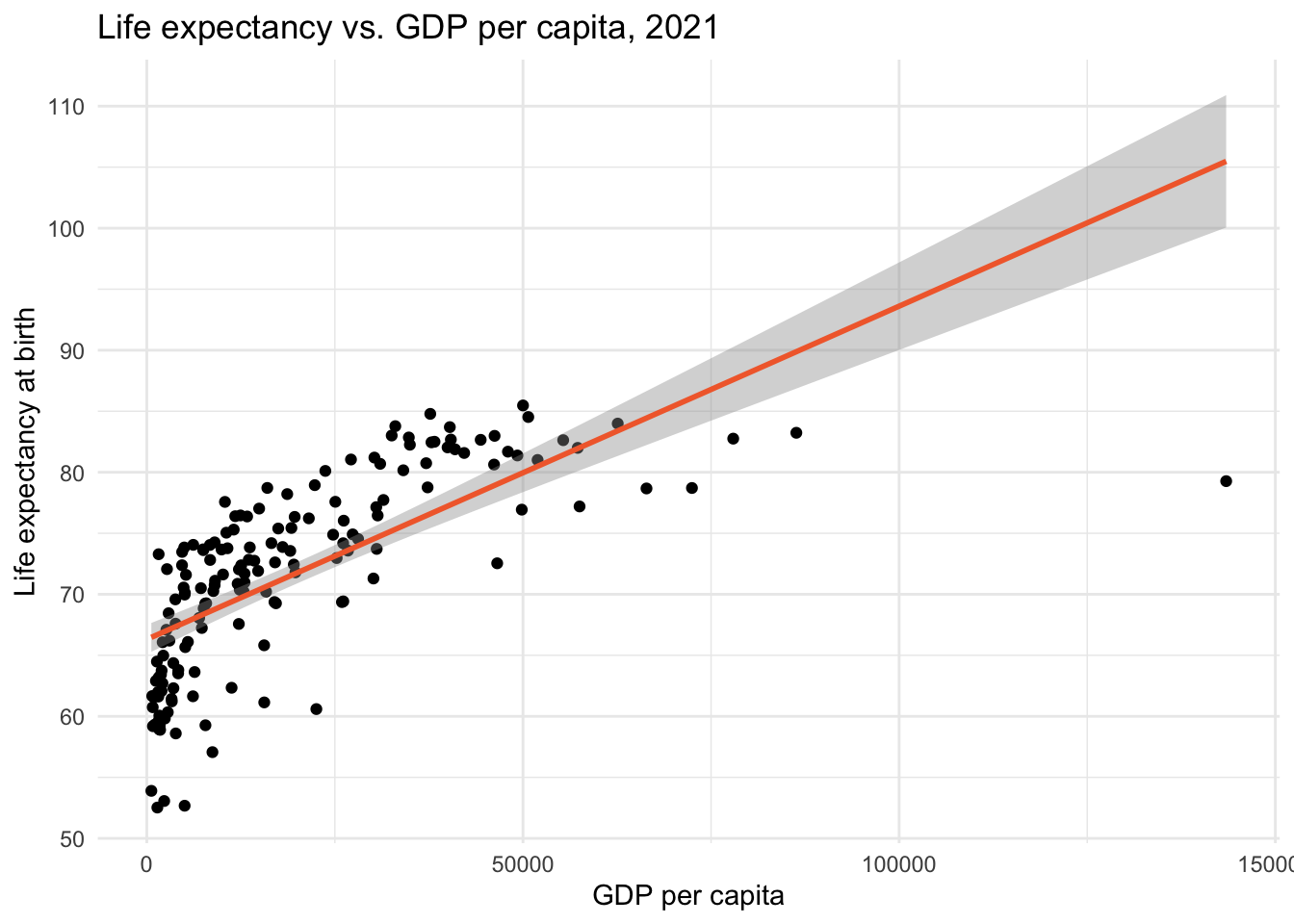 We’ll use data compiled by Our World in Data on gross domestic product (GDP) and life expectancy of residents in 165 countries — focusing on the data for year 2021.