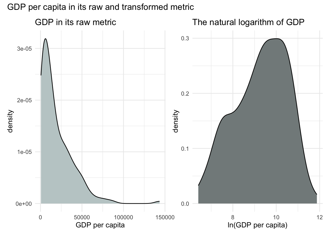 - How does applying a log transformation to GDP per capita improve model fit and interpretation?