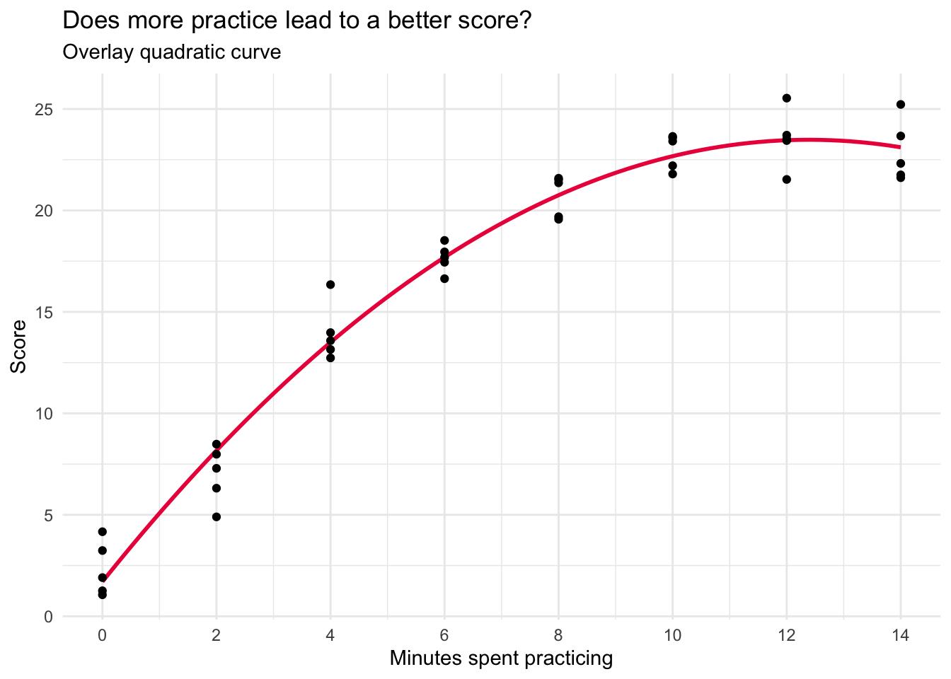From the graph, we see a clear increasing trend. However, the increasing trend appears to slow down at higher levels of practice. To better capture this pattern, we can change the linear best-fit line to a quadratic curve. This is accomplished by changing formula = y ~ x to formula = y ~ poly(x, 2), where the second argument to poly() specifies the polynomial order (2, or squared, denotes a quadratic relationship).