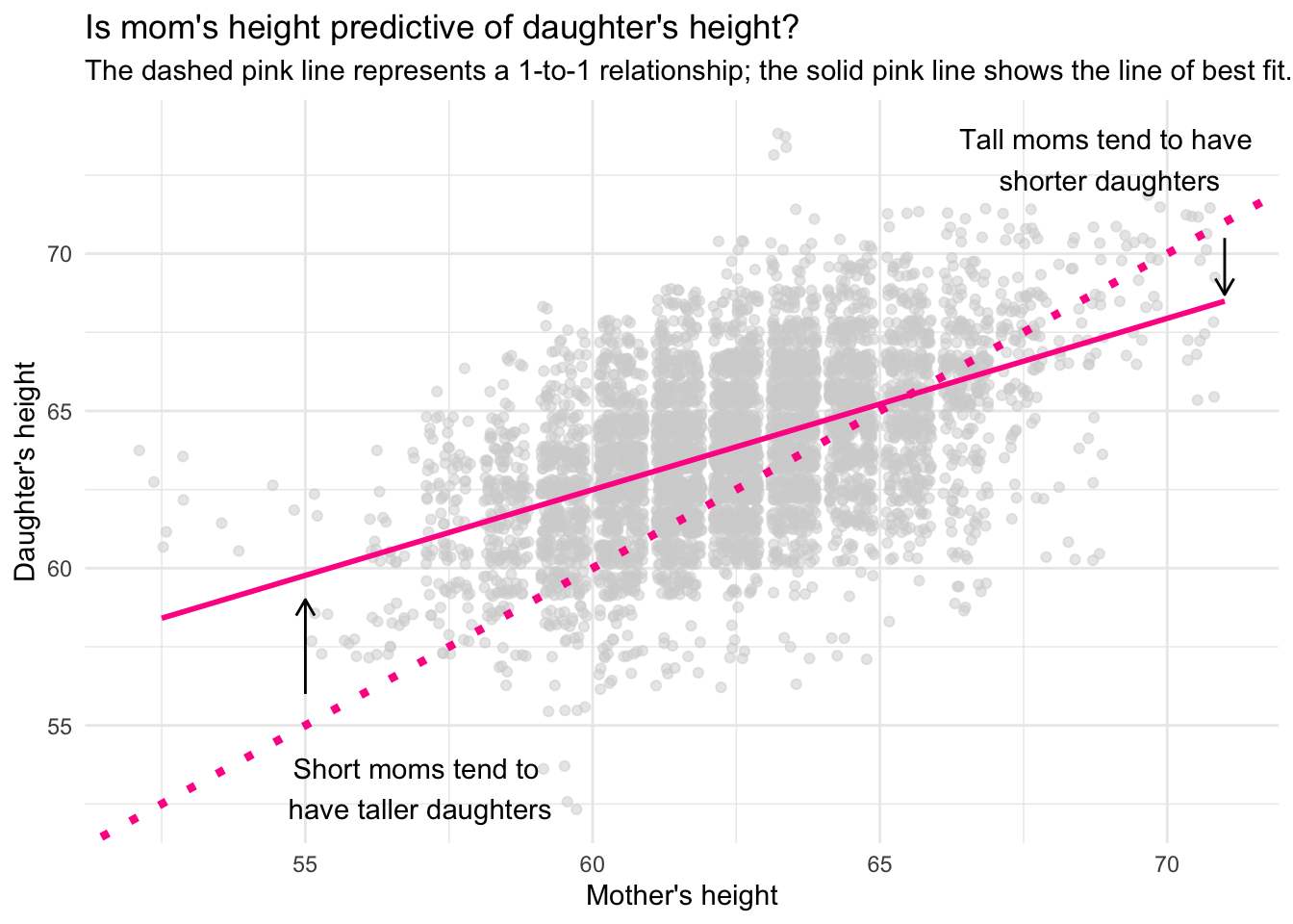 Short mothers tend to have taller daughters: Similarly, if a mother is much shorter than average (let’s say 58 inches), her daughter is predicted to be taller than her mother, but not as tall as average. Again, the daughter’s height is pulled toward the mean, so while she’s still shorter than most people, she’s predicted to be taller than her very short mother. This explains why the solid pink line is above the 1-to-1 line for shorter mothers — daughters of short mothers are “pulled” upwards, closer to the average height.